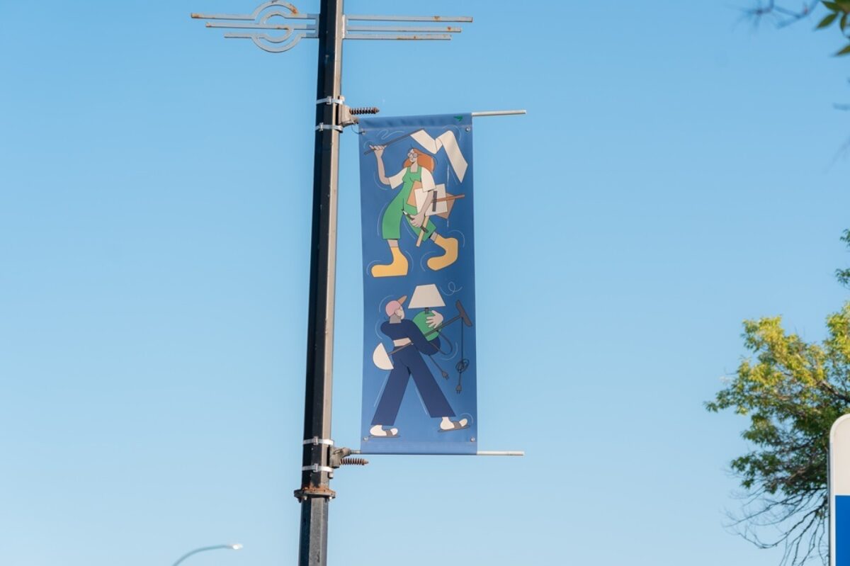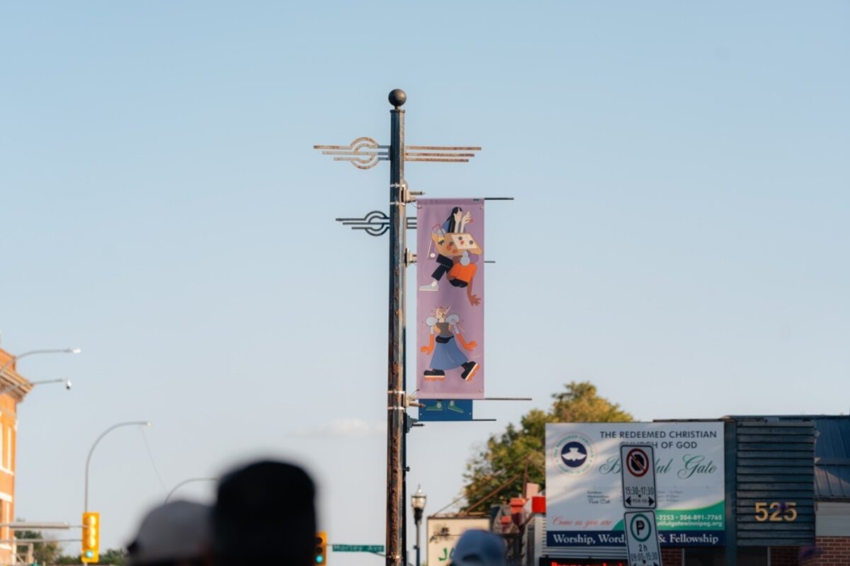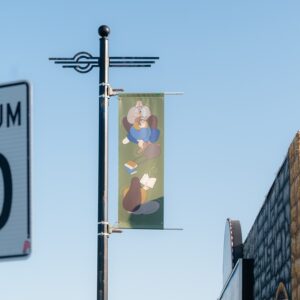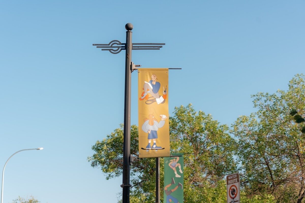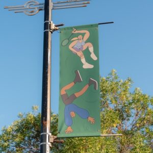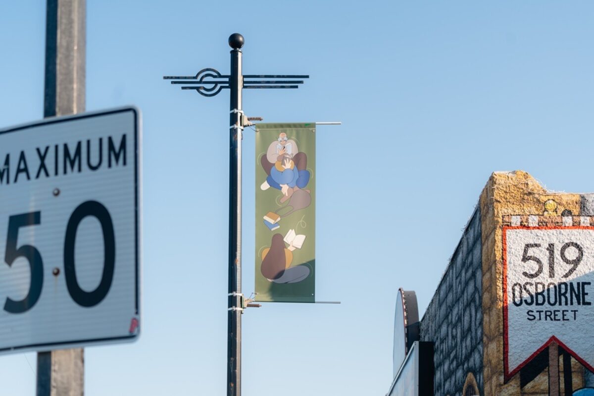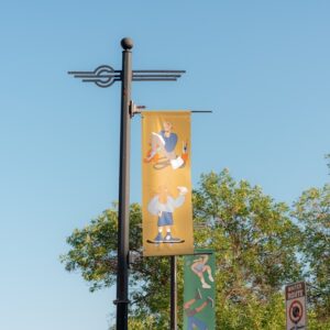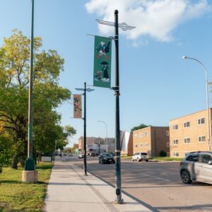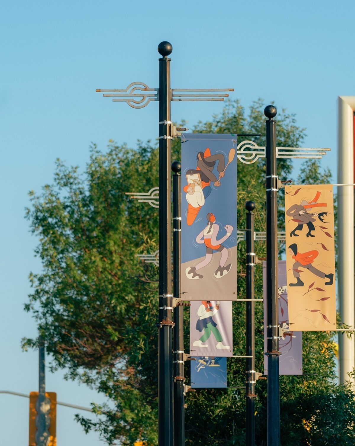 These 22 street banners — designed by Cato Cormier — reflect the energy and spirit of the South Osborne neighbourhood in Winnipeg. The banners will be installed for at least two years as part of a partnership between the Winnipeg Arts Council and the South Osborne BIZ. This project aims to celebrate the unique character of South Osborne — a cozy, walkable area filled with vibrant community life. The artwork is meant to draw people in, encouraging them to explore the area and connect with community.