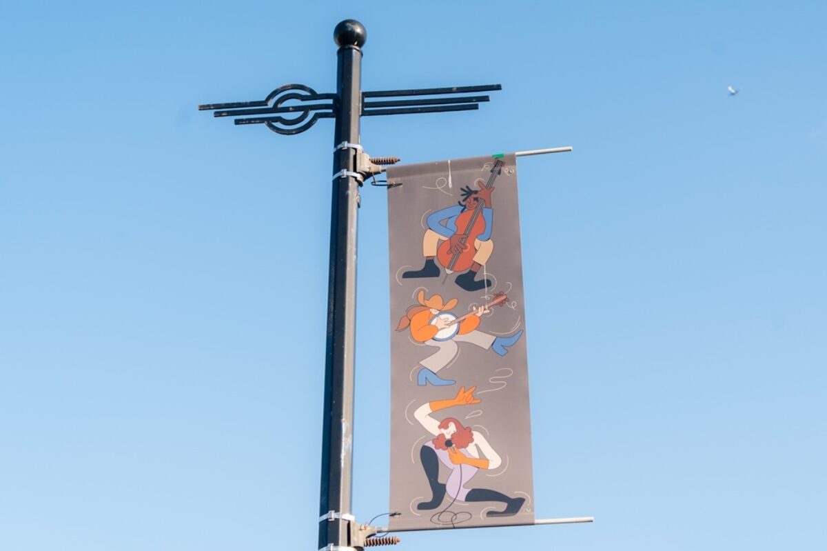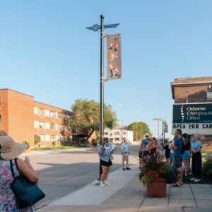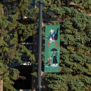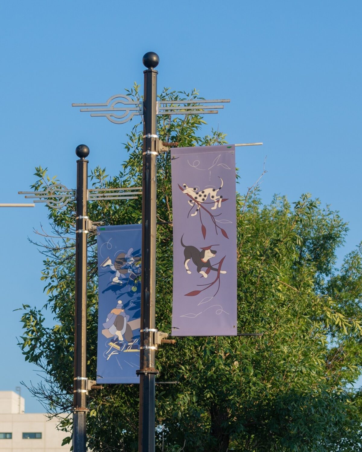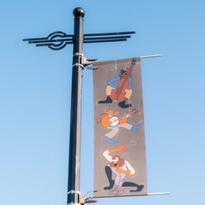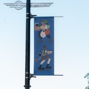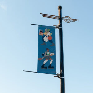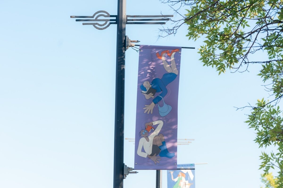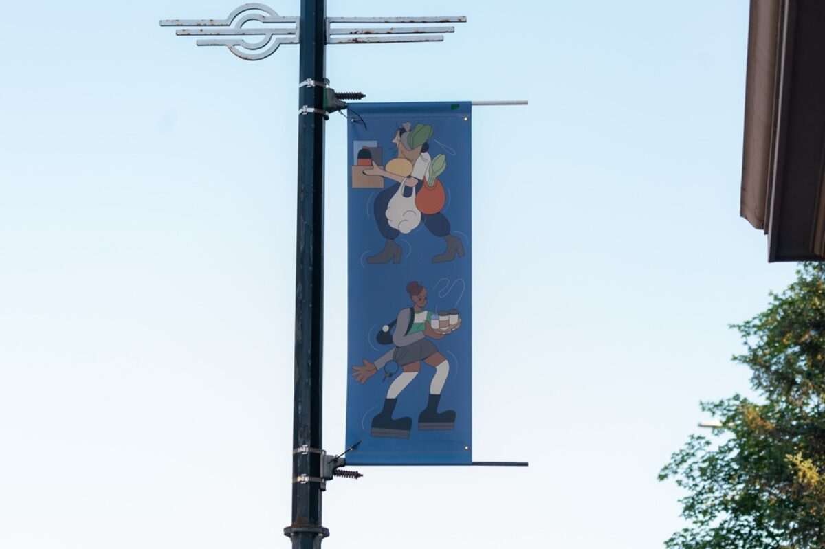 Cormier’s illustrations are playful, colourful, and cartoonish. The characters that make up their banner designs are lively and eccentric, reflecting the variety of people who live in and visit South Osborne. Some banners even tell a story. Look for a banner near Mulvey that shows a stormy day and hints at a windblown tree; and another nearby that shows dogs happily carrying branches in the aftermath of the storm.